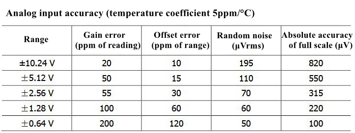 - Multi-range input, each channel can independently configure the ranges. ±24V (only in differential mode), ±20V (only in differential mode), ±10V, ±5V, ±2.5V, ±1.25V, ±0.5V