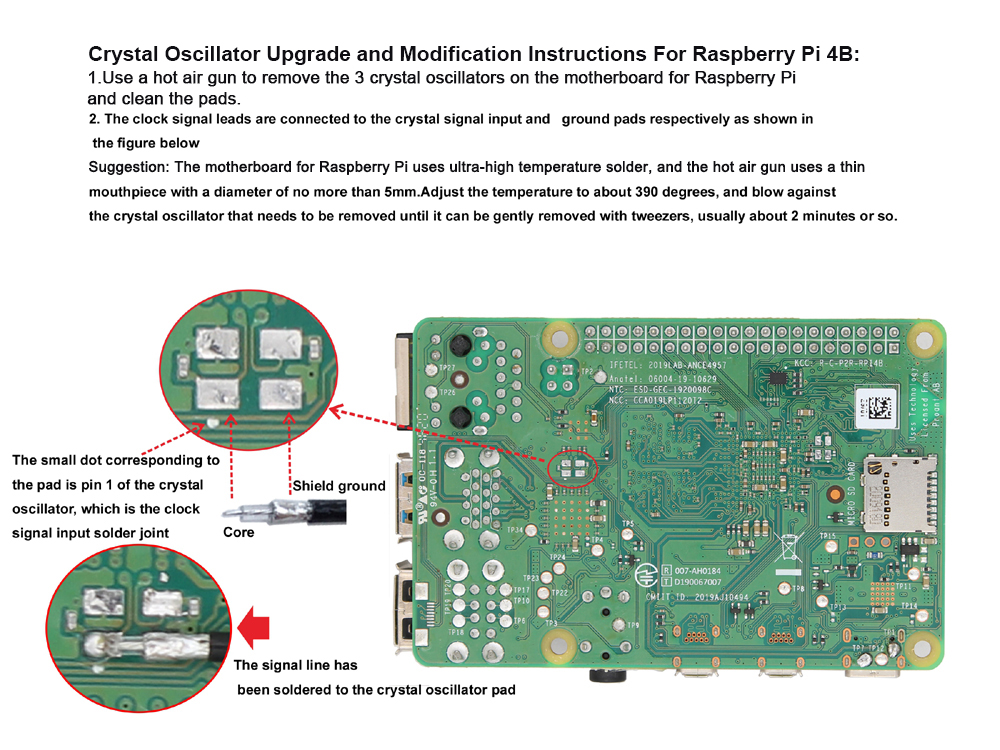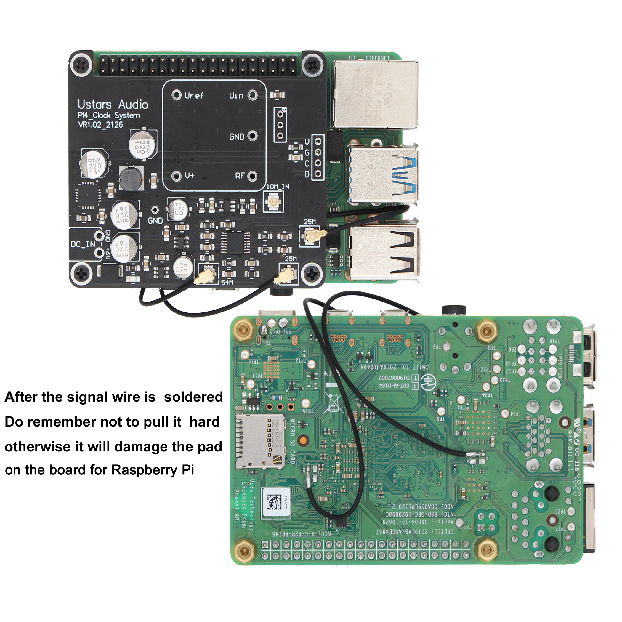 2. For Raspberry Pi upgrade clock involves removing a crystal oscillator on the motherboard for Raspberry Pi and soldering the signal leads to the corresponding position. The operating space is very small, and the solder joints are very small. Buyers are required to have high hands-on ability. The success of the upgrade also depends on the buyer’s hands-on ability, so we only guarantee that the product meets the output parameters described in the product introduction. As for the success of the upgrade or the risk of damage to the clock board, motherboard for Raspberry Pi or other components during the upgrade process, buyers shall bear the risk.