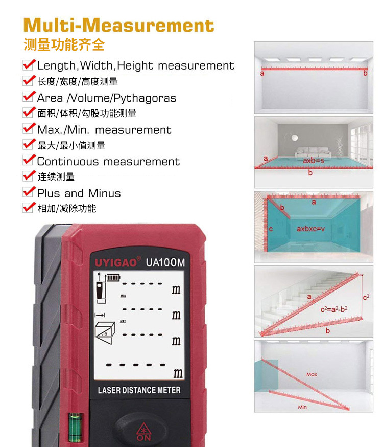 UYIGAO UA100M Handheld Laser Distance Meter Laser Distance Measurer Range 0.05-100M/0.16-328.1FT