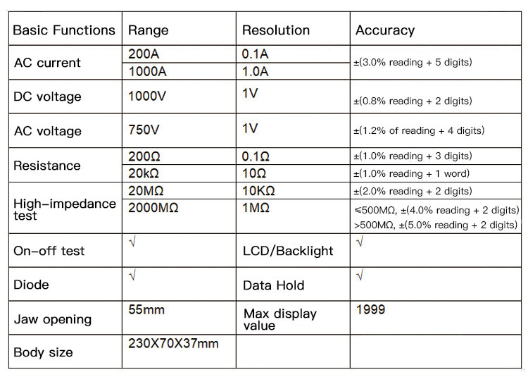 - Test DC voltage, AC voltage, AC current, diode, resistance. On-off buzzer, LCD backlight, and data hold functions