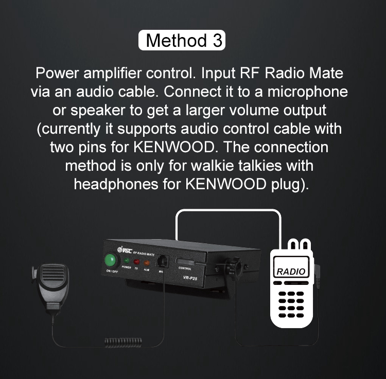 - Compatible walkie talkie: 25W (not included)-50W (included)