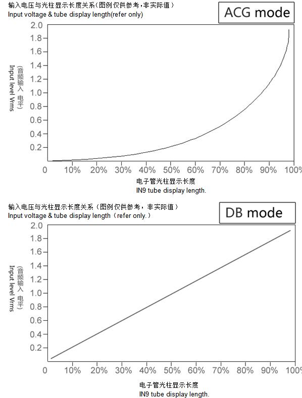 1.In ACG mode, the VU meter is driven by a dynamic square root audio compression algorithm, which means that the relationship between input volume and light beam swing is not proportional. It can be seen from the relationship diagram that when the input volume is small, the swing amplitude of the light beam is larger, and when the volume gradually increases, the swing amplitude of the light beam gradually becomes smaller. In this mode, users can use the VU meter in a larger audio input range without adjusting gain, and can obtain a good display effect at the same time. When the light beam jumps with music, even if volume input is too small, light beam will jump. Even if volume input is large, the maximum swing will not be reached. It is recommended to adjust GAIN to make the beam of light swing as close as possible to 70% (0dB), the effect is better. Driven by the algorithm of dynamic square root audio compression, it cannot truly display the true level of the current input volume, so it is not suitable for professional recording occasions. But this mode is suitable for people's regular hearing habits. Because human ear hears sound and the loudness of the sound has a ratio, not 1:1. For example, a 20W speaker and a 100W speaker have a power ratio of 5 times. If tubes are lit according to the actual length, there should be 5 times the display length change. But human ear does not sound like this, and only feels that the sound is only about 2 times different in loudness. That is to say, the sound of 100W seems to be only twice as loud as the 20W (about 40W, which is not the case). This is the actual difference, so in this case, if the light beam is lit up to about twice the length of the human vision It can match with hearing. Feeling more comfortable. But if it jumps according to the real value. The beam of light was lit up 5 times the length, which caused the sensory mismatch. Relatively less comfortable. (Only for most people, not all situations.)