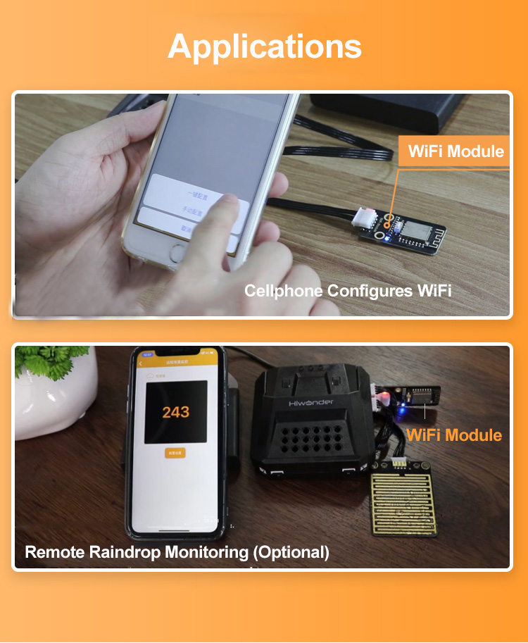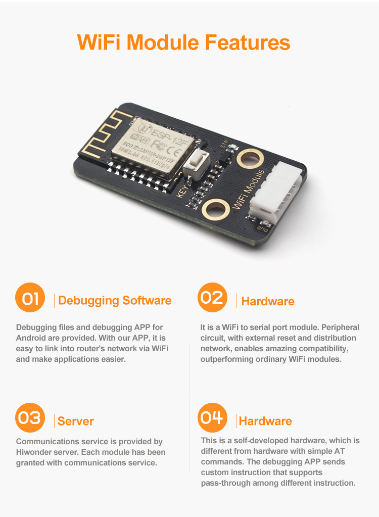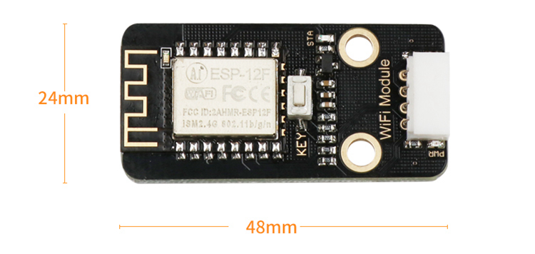 WiFi module supports 802.11b/g/n, with high receiving sensitivity. It features compact size with on-board antenna. Supporting WAN, it fits IoT projects.