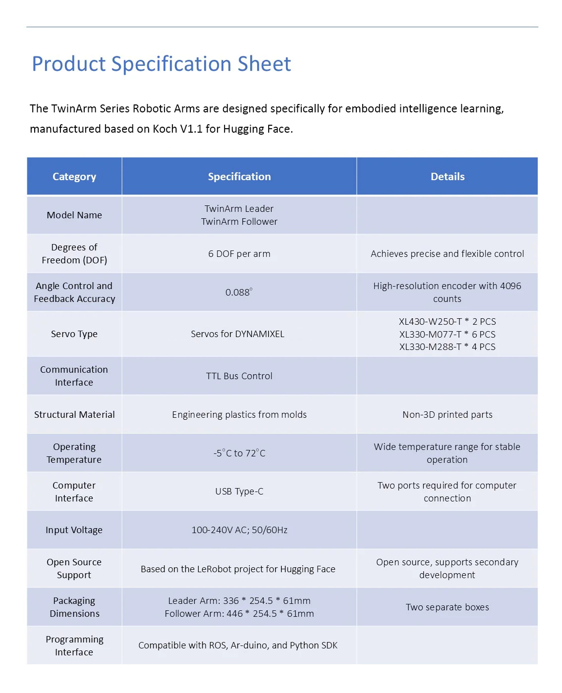 The TwinArm Robotic Arm is developed and manufactured based on the open-source LeRobot project's Koch V1.1 for Hugging Face. It fully meets the hardware requirements of the open-source project, while achieving significant enhancements in appearance, manufacturing process, and quality. This product is ready for immediate use and enables users to quickly engage in research related to the LeRobot project.