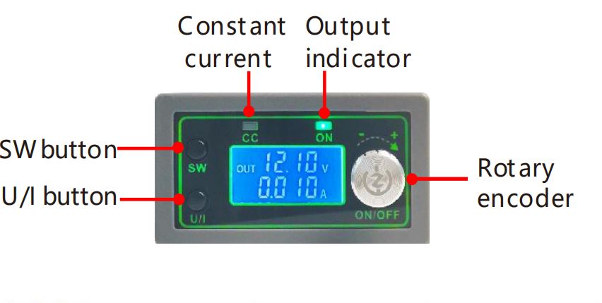 In normal interface, long press U/I button to enter parameter setting interface. Short press SW button until the interface with Zero appears, with Zero+OUT+A symbol, long press rotary encoder to complete zero calibration. Short press SW button, the parameter interface of CAL appears. CAL+IN+V symbol is calibration input voltage interface; CAL+OUT+V symbol is calibration output voltage interface; CAL+OUT+A symbol is calibration output current interface. The rotary encoder can adjust the parameter size to the value actually measured with a multimeter. After the adjustment is completed, long press rotary encoder to confirm that the adjustment is complete. At this time the parameter value is not flashing. Press and hold U/I button to return to normal interface.