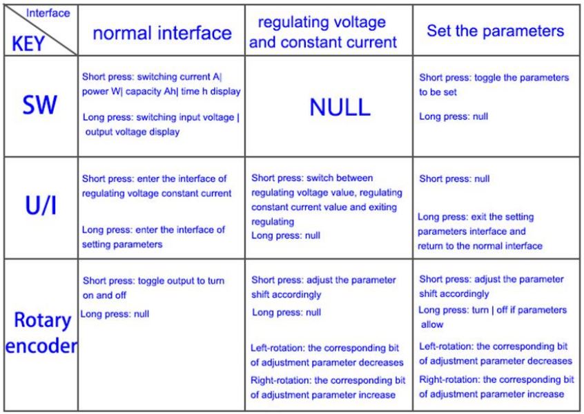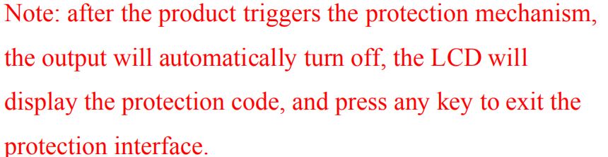 Short press rotary encoder to select which digit you want to set the protection parameter. Long press rotary encoder to set the protection parameters on or off (only timeout protection and over capacity protection can be set on/off, other protection parameters are on by default.). Rotary encoder can make parameter bigger and smaller. After setting, long press U/I button to return to normal interface.