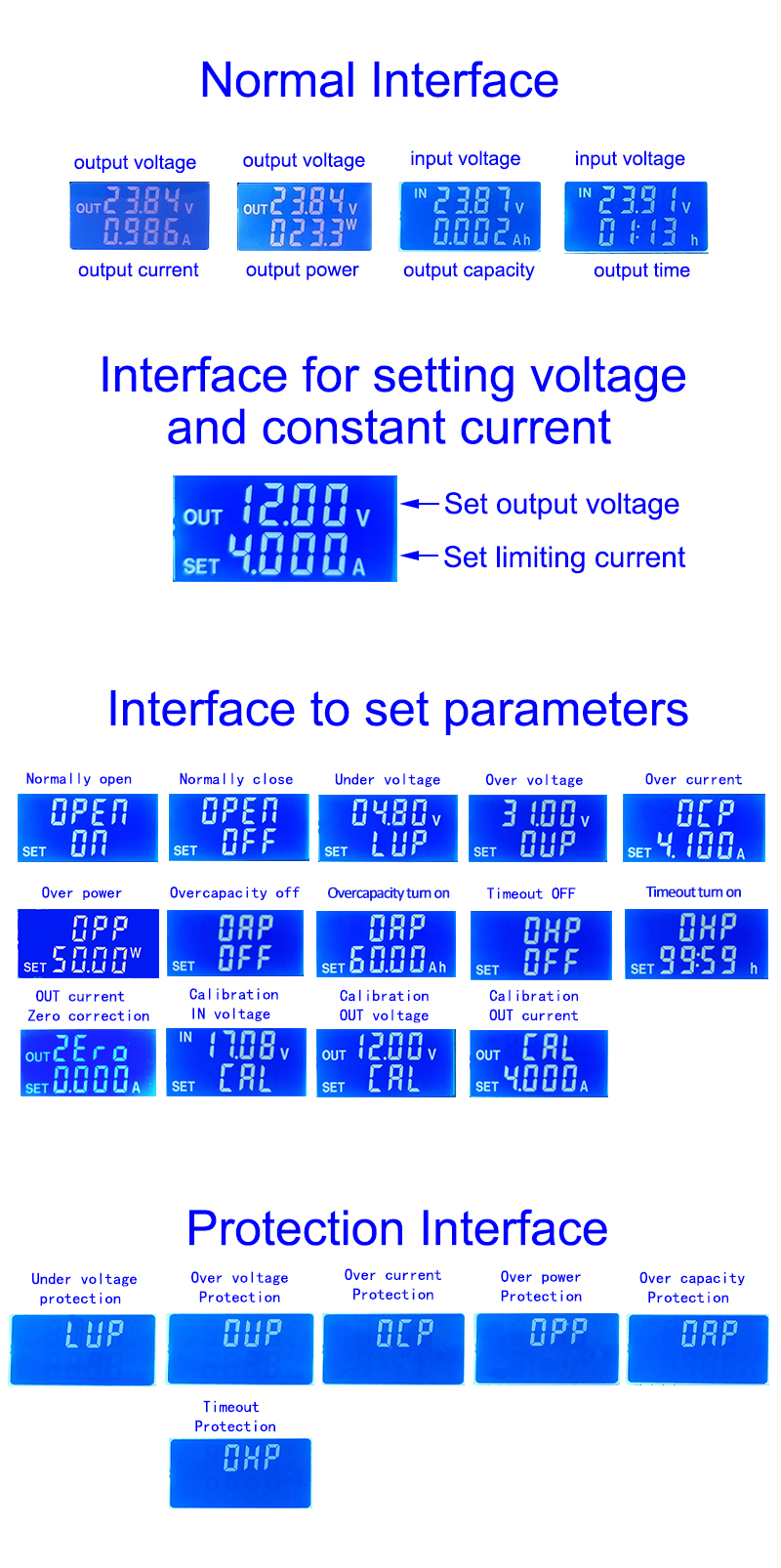 In normal interface, long press U/I button to enter parameter setting interface. Short press SW button until the protection parameters you want to set appear.