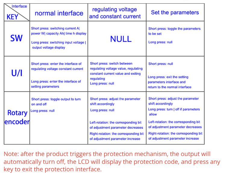 Short press rotary encoder to select which digit you want to set the protection parameter. Long press rotary encoder to set the protection parameters on or off (only timeout protection and over capacity protection can be set on/off, other protection parameters are on by default.). Rotary encoder can make parameter bigger and smaller. After setting, long press U/I button to return to normal interface.