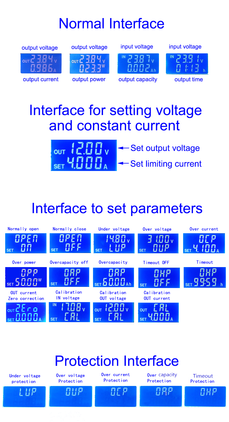 In normal interface, short press SW to switch the display on the lower line of the display, display content switches among current A, power W, capacity Ah, time h. Press and hold SW button to switch the upper display of the display, and display content switches between input voltage IN and output voltage OUT.