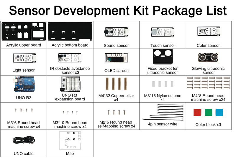 - Sensor kit with UNO R3 and UNO R3 expansion board support for Arduino programming