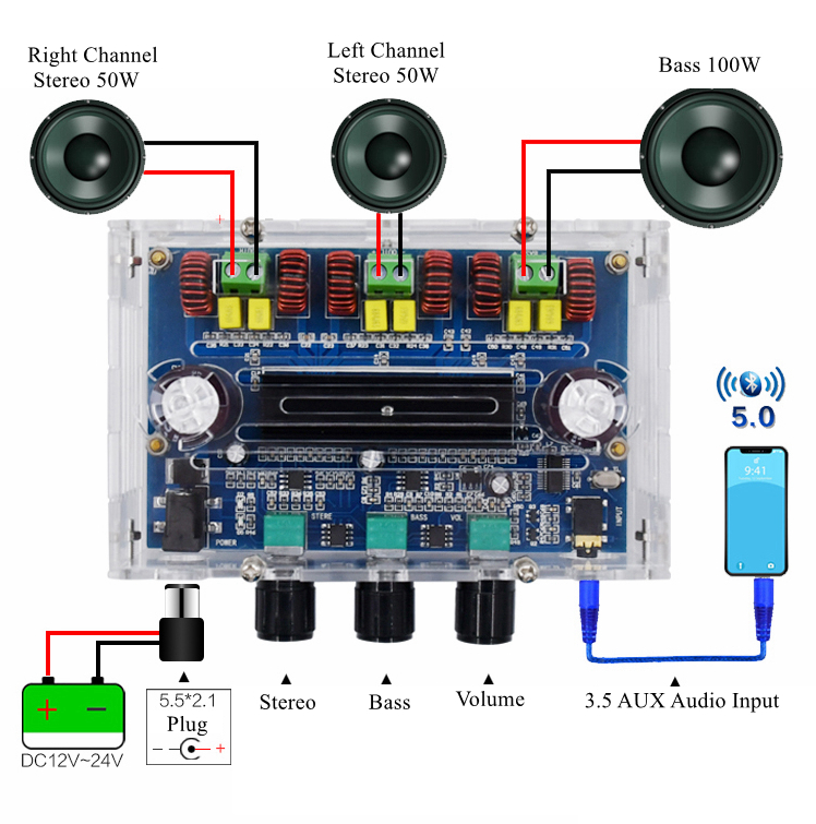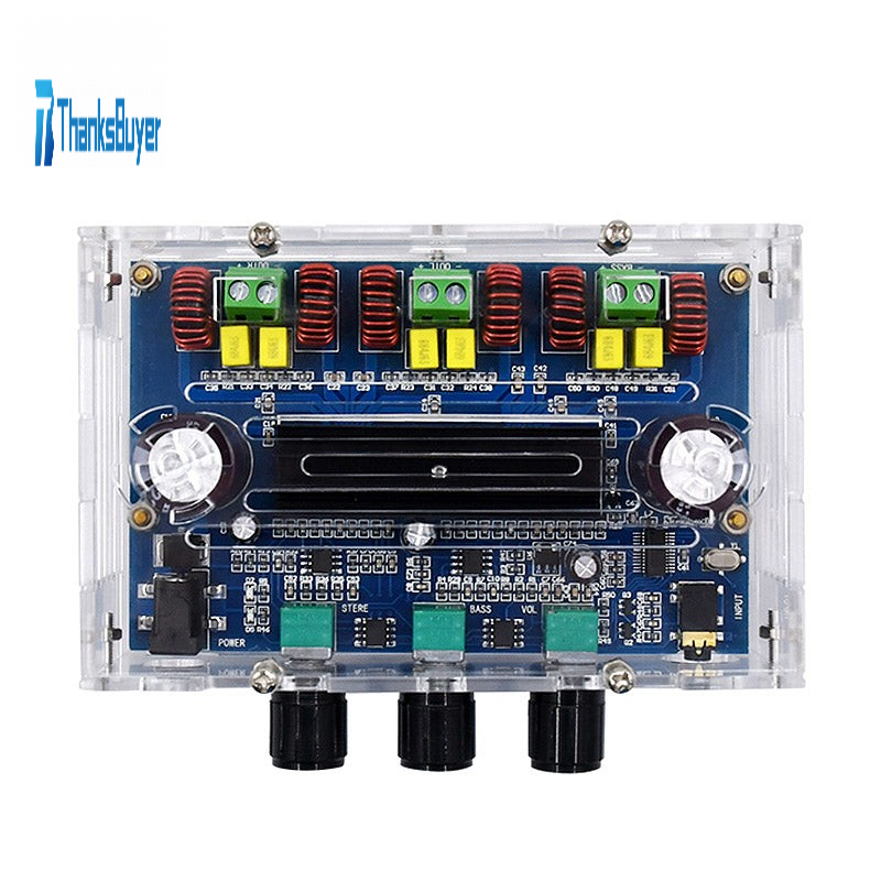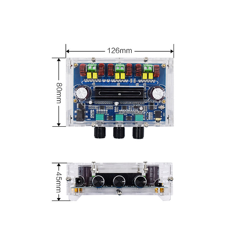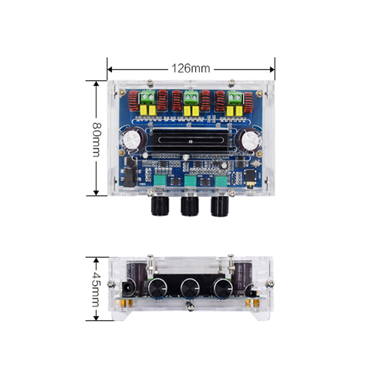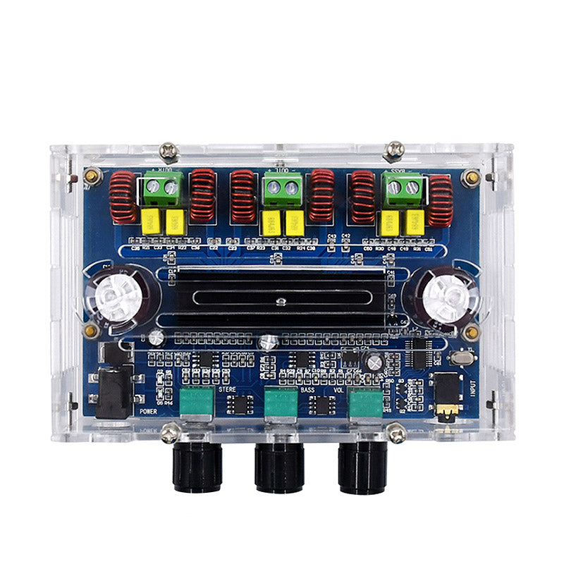 It is suitable for 2pcs 50W stereo and 1pcs 100W bass speakers. It adopts 2pcs TPA3116D2 chips, high-efficiency Class D operation, high-definition sound quality. It is mainly used in home theater and active speakers.
