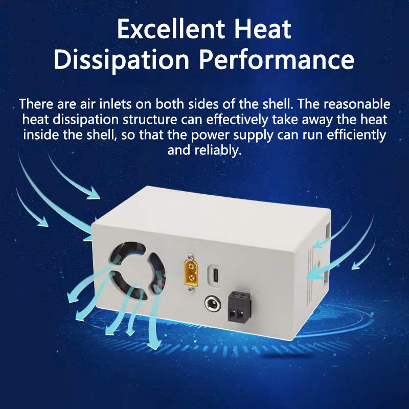 - Excellent heat dissipation performance: With an intelligent temperature control fan. There are air inlets on both sides of the shell. The reasonable air outlet heat dissipation structure can effectively take away the heat inside the shell, so that the power supply can run efficiently and reliably