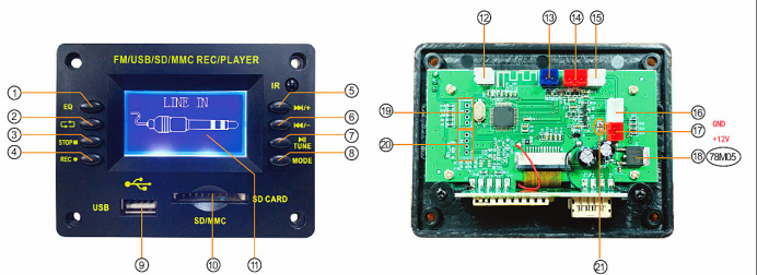 * 8: MODE button. Short press to switch between AUX/USB/SD/BT/FM modes. Long press the button when playing a recording file to delete the currently playing recording file.