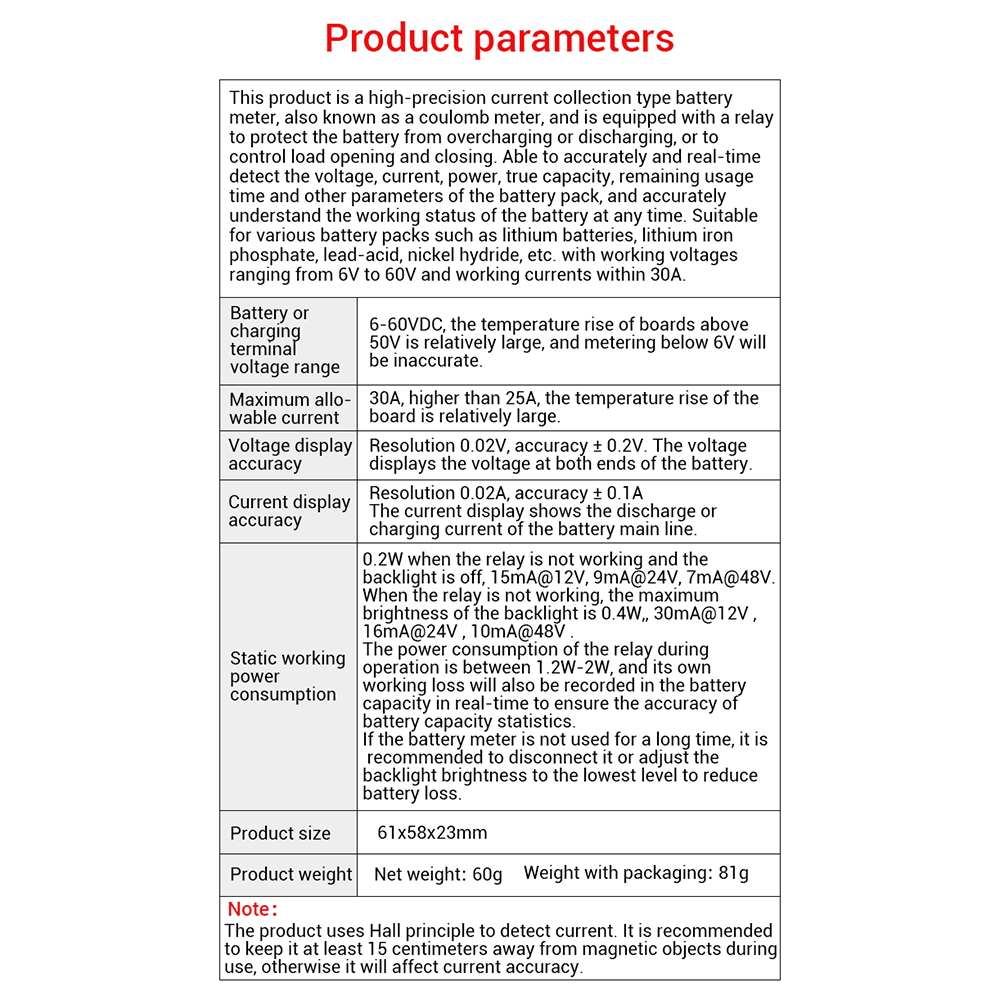 - Battery or charging terminal voltage range: 6 - 60VDC
