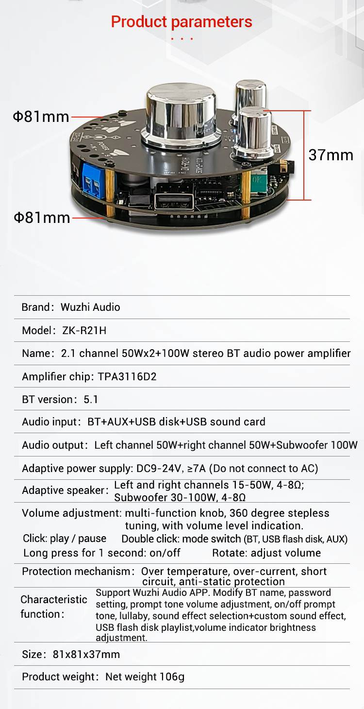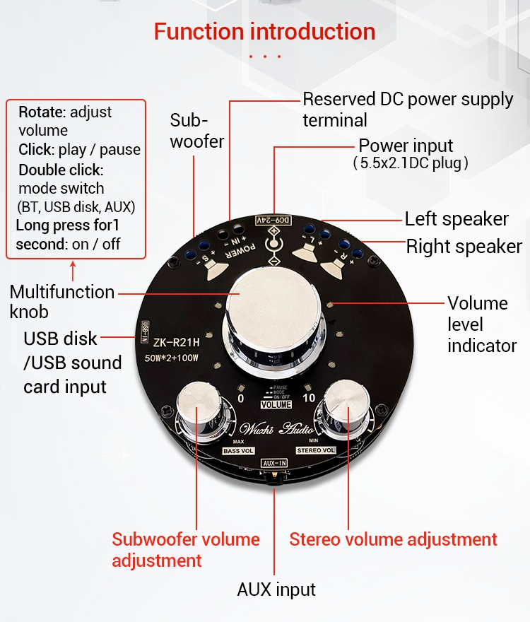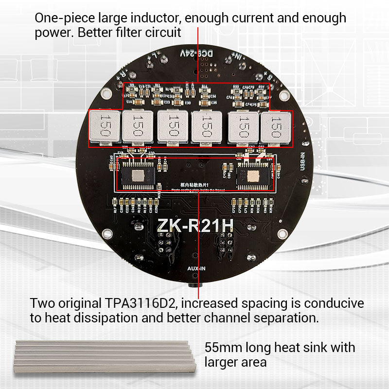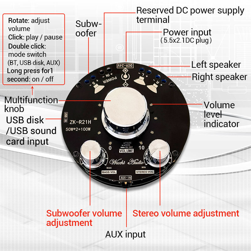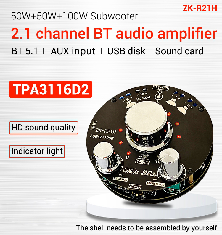 ZK-R21H 2.1 Channel Amplifier Bluetooth Amplifier Board TPA3116D2 with Volume Indicator Bass Treble