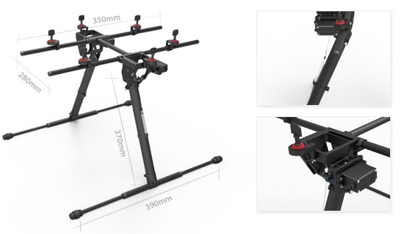 Retract freely giving a 360 degree view: The retractable landing gear will not block the view of the camera lens, making smooth shooting in all directions possible. Gone are the days of seeing any part of your S800 in a shot. |