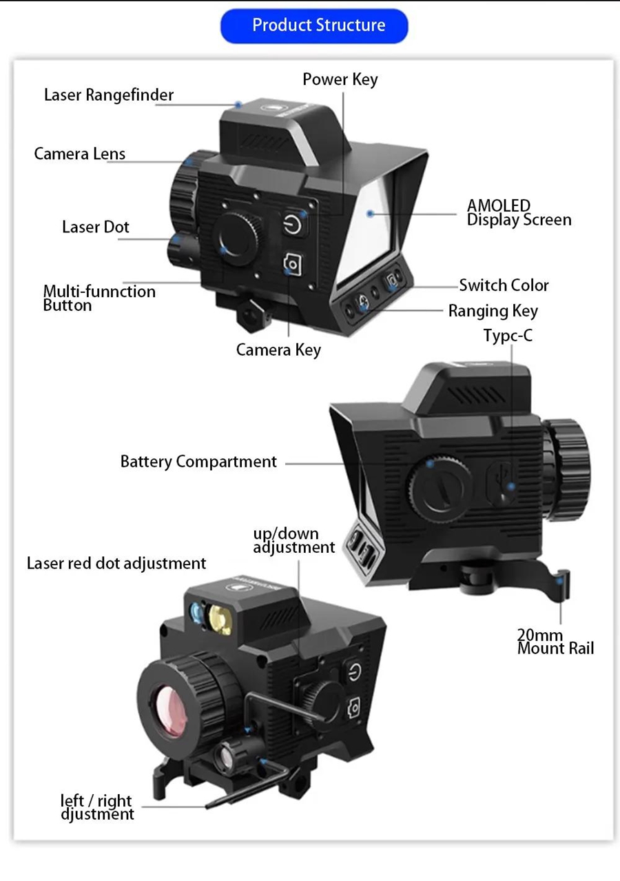 - Product functions: dual-purpose search and sighting, quick disassembly and assembly, high-precision trajectory calculation, convenient trajectory recording, 1200 meter laser ranging, hotspot tracking, UVC digital video, electronic zoom, WIFI, Photo/video playback.