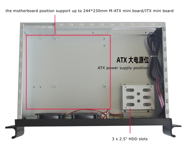 - Motherboard: support for mini M-ATX, ITX motherboards (support up to 244 x 230mm)