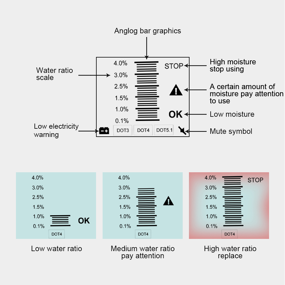 5. Immerse the probe into brake fluid and you will get different colors of LED lights, they indicate:
