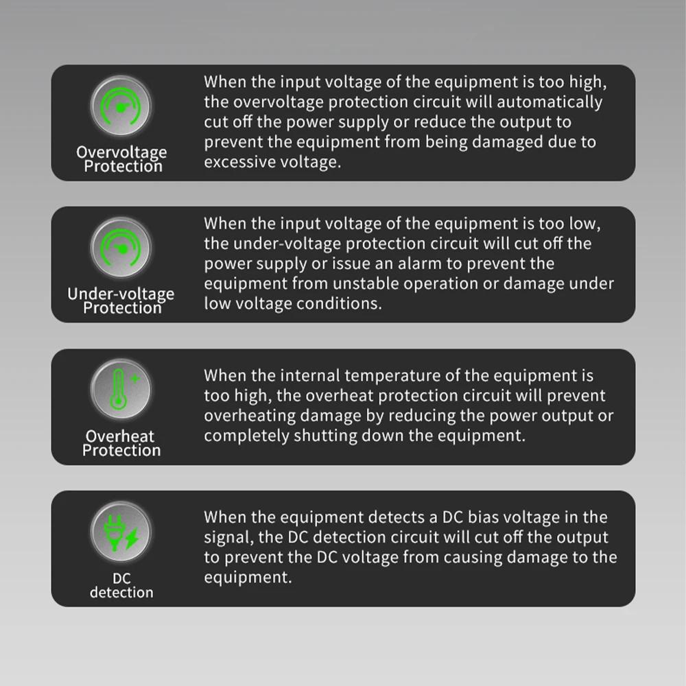 - Production mechanism: over-voltage/undervoltage/overheat/DC detection protection