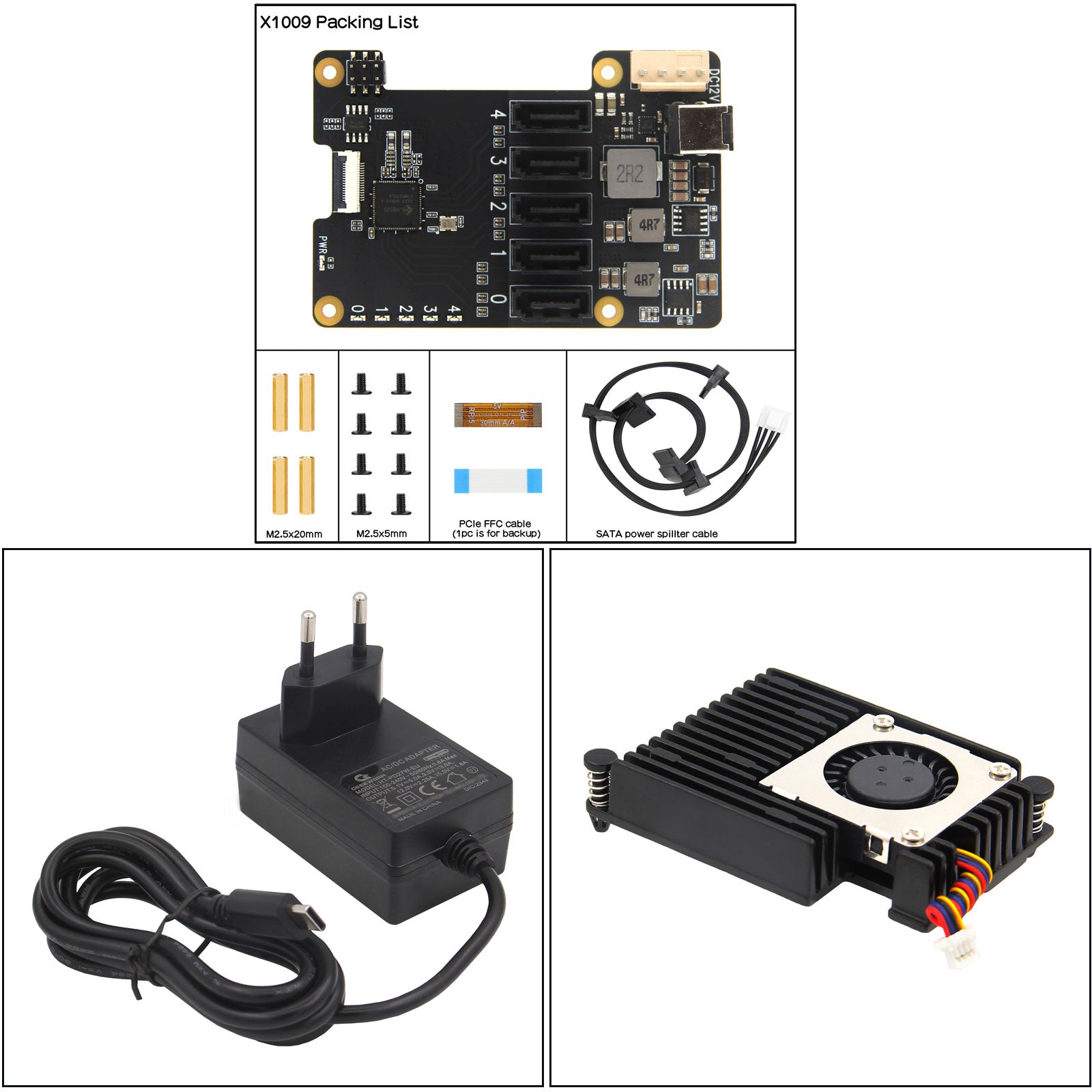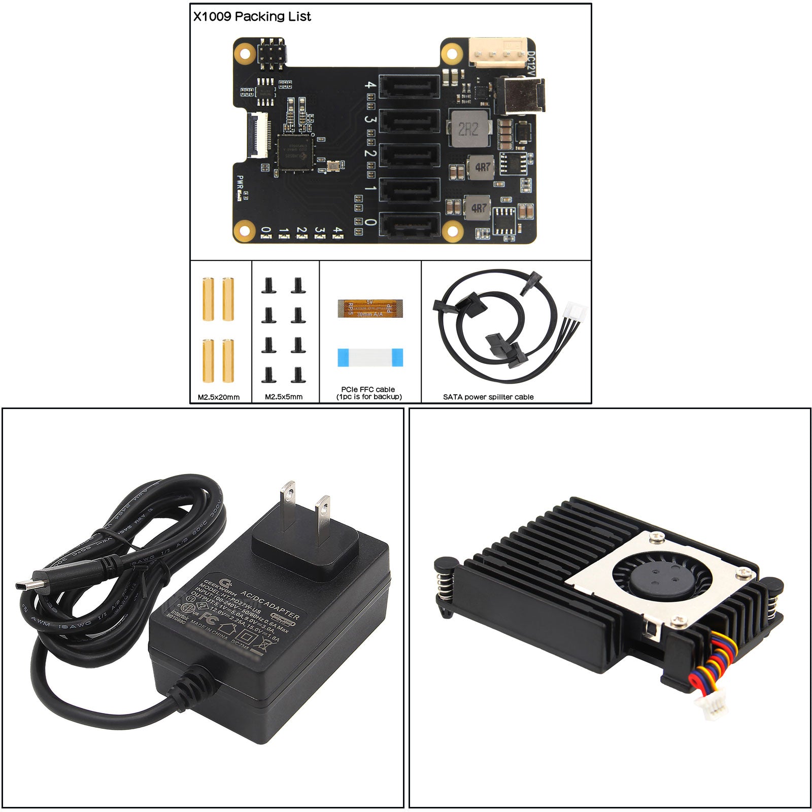 Geekworm X1009 PCIe to 5-Port SATA Expansion Board + H505 Heatsink + DC 12V 5A Power Adapter (US/EU Plug)