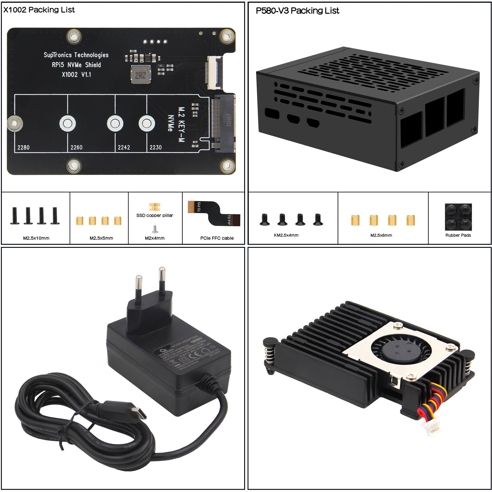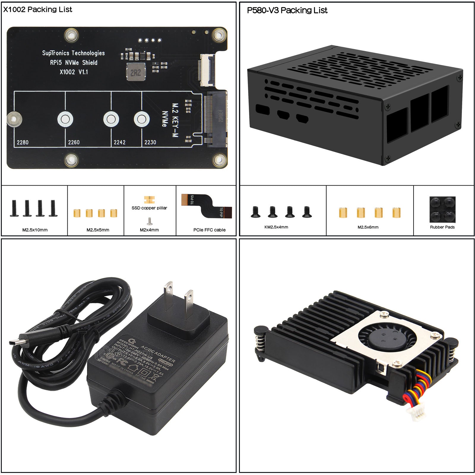 Geekworm X1002 PCIe to M.2 NVMe SSD Expansion Board + P580 Metal Case + H505 Heatsink + PD27W (US/EU Plug)