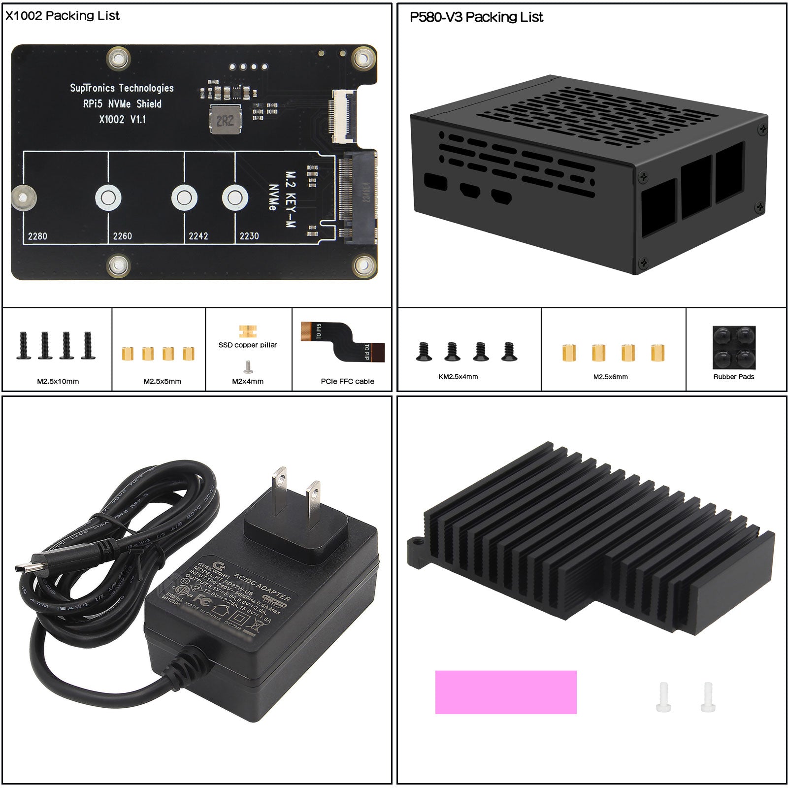 Geekworm X1002 PCIe to M.2 NVMe SSD Expansion Board + P580 Metal Case + H509 Passive Heatsink + PD27W US/EU Plug