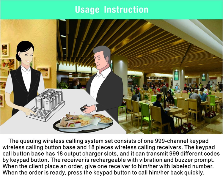 This wireless queue calling system adopts 999 channels keyboard and 18 pieces of pagers to improve the working efficiency to a great extent and avoid the waiting of the client in the long queue. Built-in antenna spreads the work distance to a great extent. Furthermore, 2 indication modes of vibration and buzzer make it suitable for different situations.