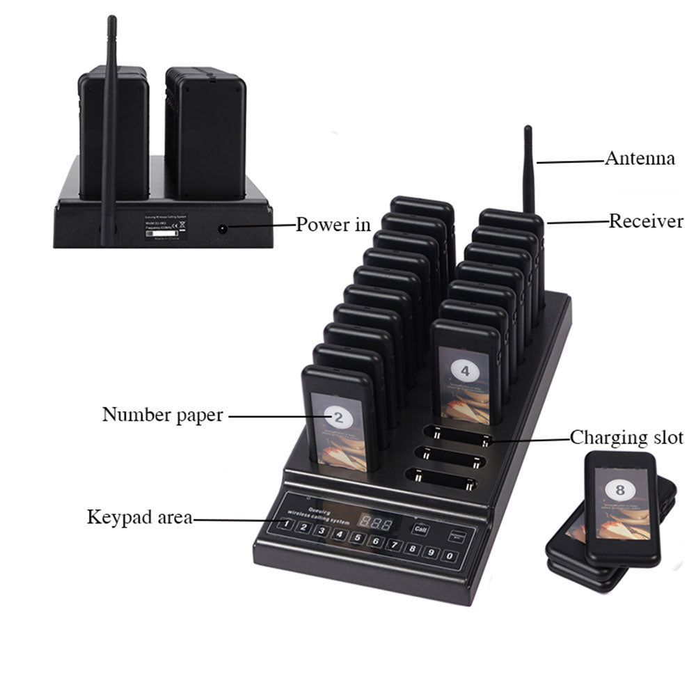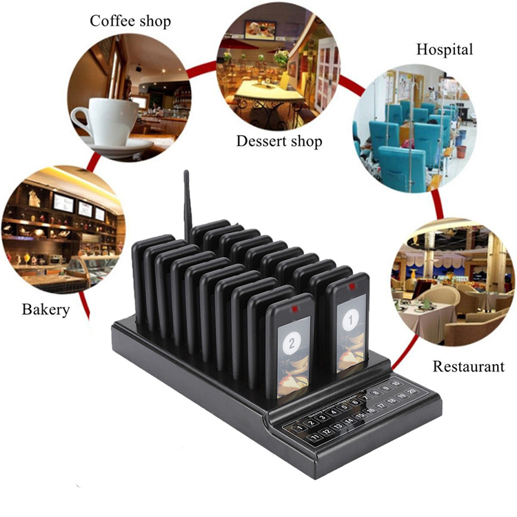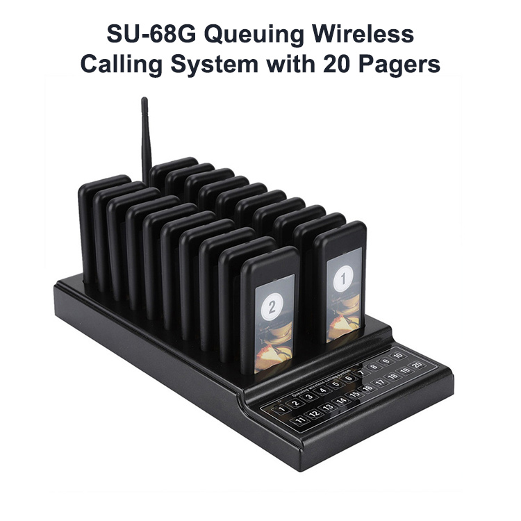 The SU-68G queue wireless system is a 20-channel system that comes with 20 pagers. The fixed 20-channel version is easier to operate; for example, to call customer number 19, simply press the "19" button. It supports only pagers numbered from 1 to 20.