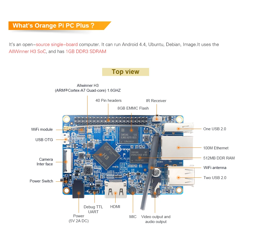 Orange Pi PC Plus RAM 1G with 8GB Emmc Flash Mini Open-Source Single Board Support 100M Ethernet Port/Wifi/Camera/Hdmi/IR/MIC