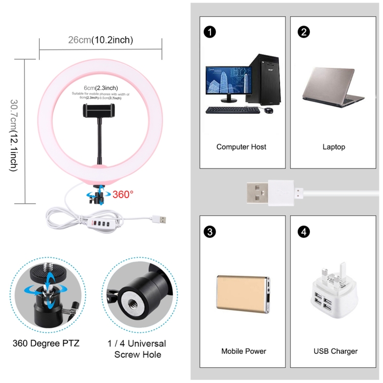 5. The USB ports can be used with multiple devices, such as connect computer host, laptop, mobile power and USB charger. You will be able to enjoy LED ring light at any time free.