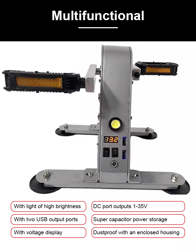 - It comes with dual USB output port, with voltage regulation, supporting fast charging. When there is no load, it is forbidden to step on the pedal quickly to prevent the voltage stabilization module from being burned out.