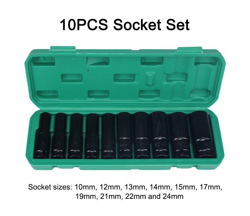 - Socket size (metric): 10mm, 12mm, 13mm, 14mm, 15mm, 17mm, 19mm, 21mm, 22mm and 24mm