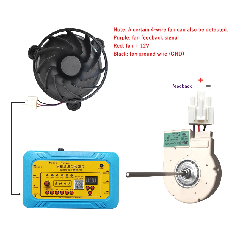 - Connect the DC fan to the detector in the order of positive (+), negative (-), and feedback as shown in the figure. Press the fan button, and if the fan speed is normal, the display screen will display the real-time feedback signal frequency (speed) of the fan to determine its integrity. If the fan does not rotate or displays E1 after 10 seconds, it can be determined that the fan is faulty.