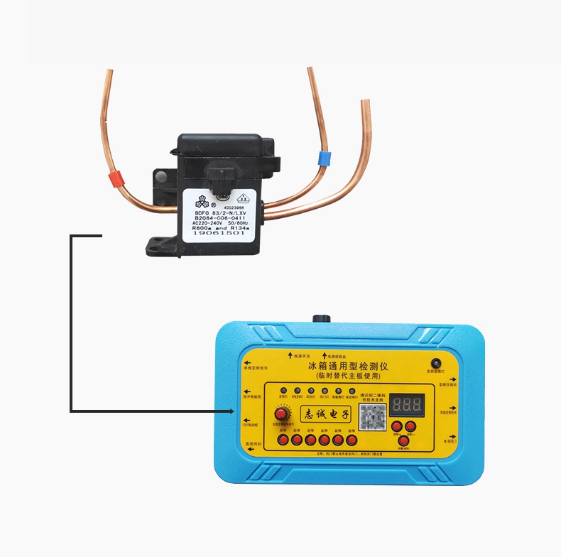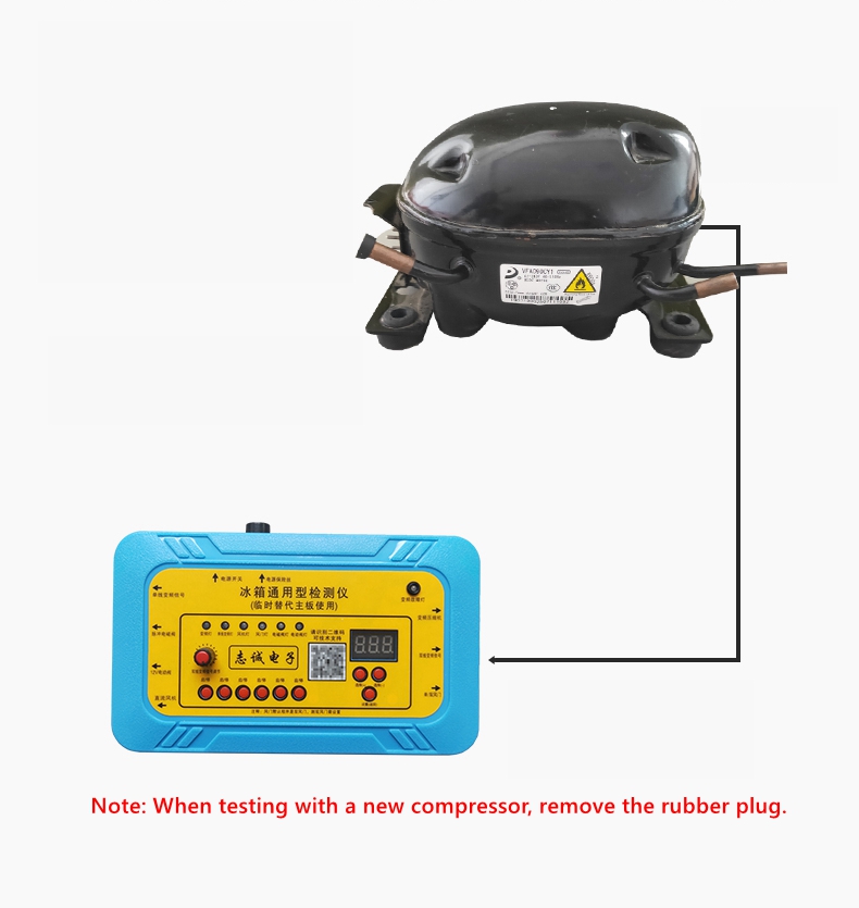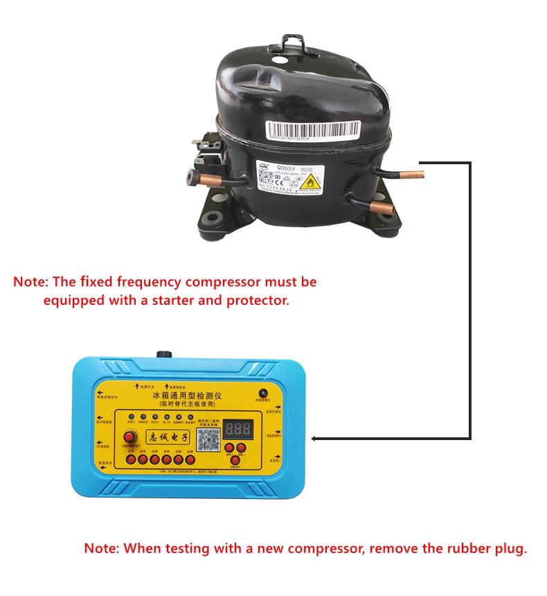 - Connect the compressor detection line to the refrigerator compressor as shown in the figure, and press the single line inverter signal button. Output voltage: 110V, the compressor can be directly started. If the compressor does not start, it can be determined that the compressor is faulty. (Attention! Once the compressor is started, wait for more than 5 minutes for further testing, and wait for the system pressure to balance before testing again.).