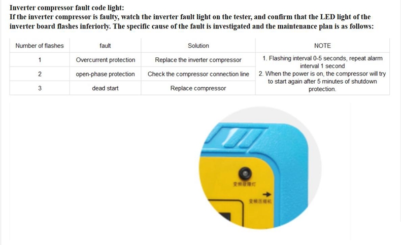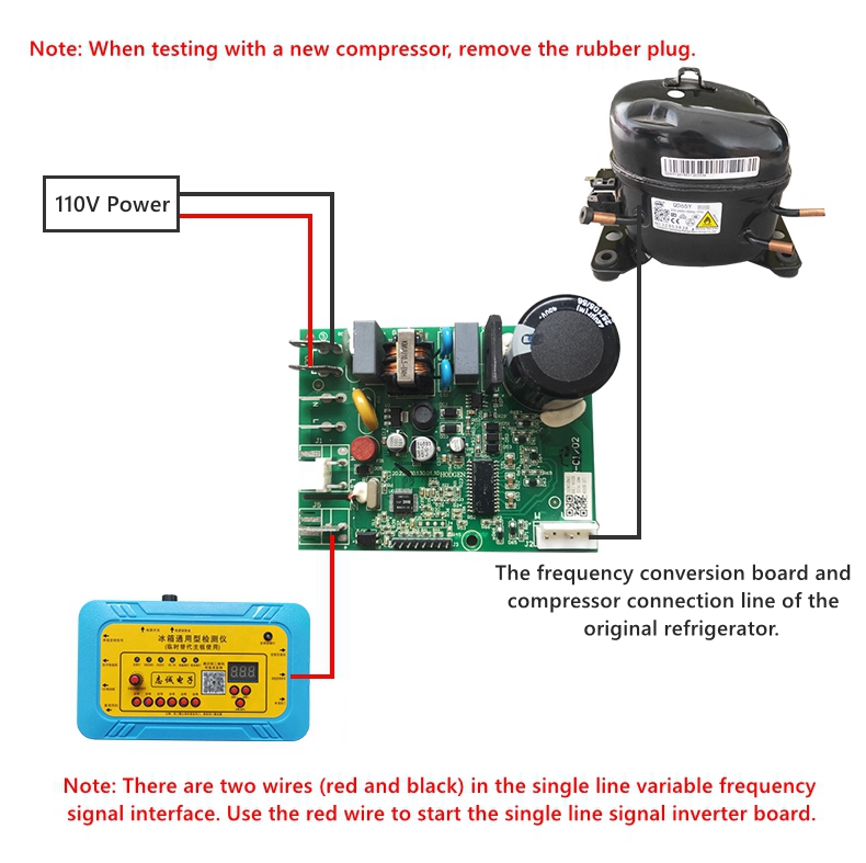 - Connect the detection line of the frequency conversion board to the communication interface of the frequency conversion board (positive and negative need to be distinguished) as shown in the figure, then connect the output end of the inverter board to the compressor, and then supply 110V power to the inverter board. Press the dual wire signal inverter key, and the detector slowly performs automatic frequency increase to reach the set frequency. When the variable frequency compressor is started, it can be eliminated one by one. If: when the frequency is set at 40-50Hz, it will rise at a frequency of 1Hz per second until the set frequency is reached. (Attention! The inverter board is all normal. If it does not start, please use the compressor detection function to test the compressor and eliminate it one by one. Once the compressor is started, it needs to wait for more than 5 minutes for further testing, and wait for the system pressure to balance before testing again.)