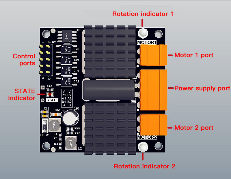 - Each channel has a two-color indicator to indicate the direction of rotation of motors