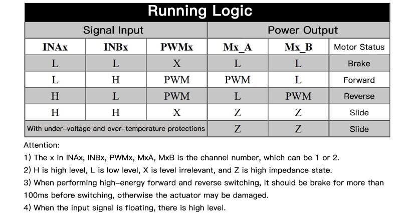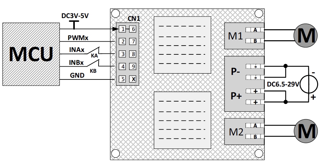 - Operating voltage 6.5-29V. Support 7-24V DC brushed motors