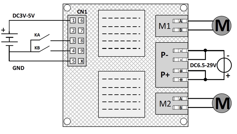 Buttons (KA, KB) control the forward and reverse rotation of motors without the involvement of MCU