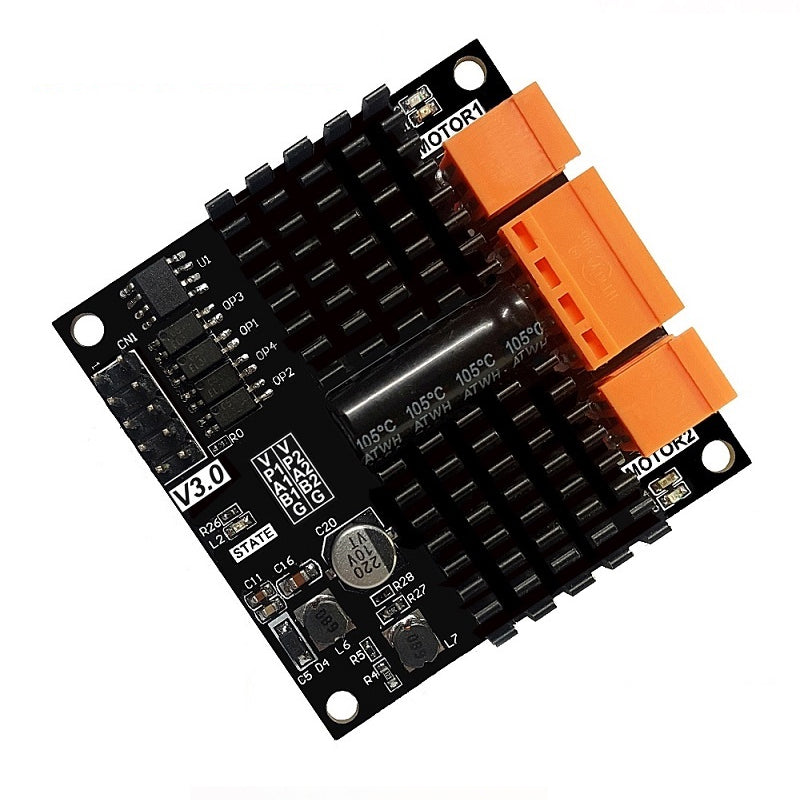 Dual DC brushed motor driver is specially designed to drive low-voltage DC motors. It uses high-performance MOSFETs to form an H-bridge drive. It can continuously output 12A current per channel and can drive a DC motor with a maximum of 300W electrical power. The timing of the components in the driver is highly optimized, allowing the minimum pulse width of the PWM input to be as low as 3us, fully ensuring the dynamic adjustment range of the PWM, and improving the control of the motor. The on-board protection circuit reduces the possibility of driver damage under abnormal working conditions. The protection status is output in real time by the indicator light. The all-optical isolation input enhances the safety of the main control MCU circuit, and can significantly improve the electromagnetic compatibility of the system.