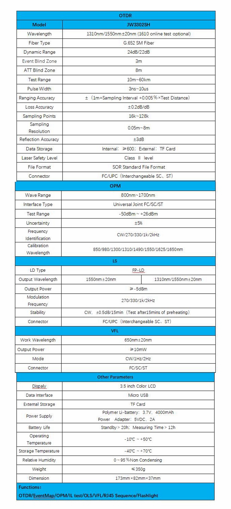 - JW3302SH OTDR is apply to FTTx and access network construction and maintenance to test fiber breakpoint, length, loss and input light automatic detection, automatic test by one key. The tester is compact with 3.5-inch colorful LCD screen, new plastic shell design, shock-proof and drop-proof.