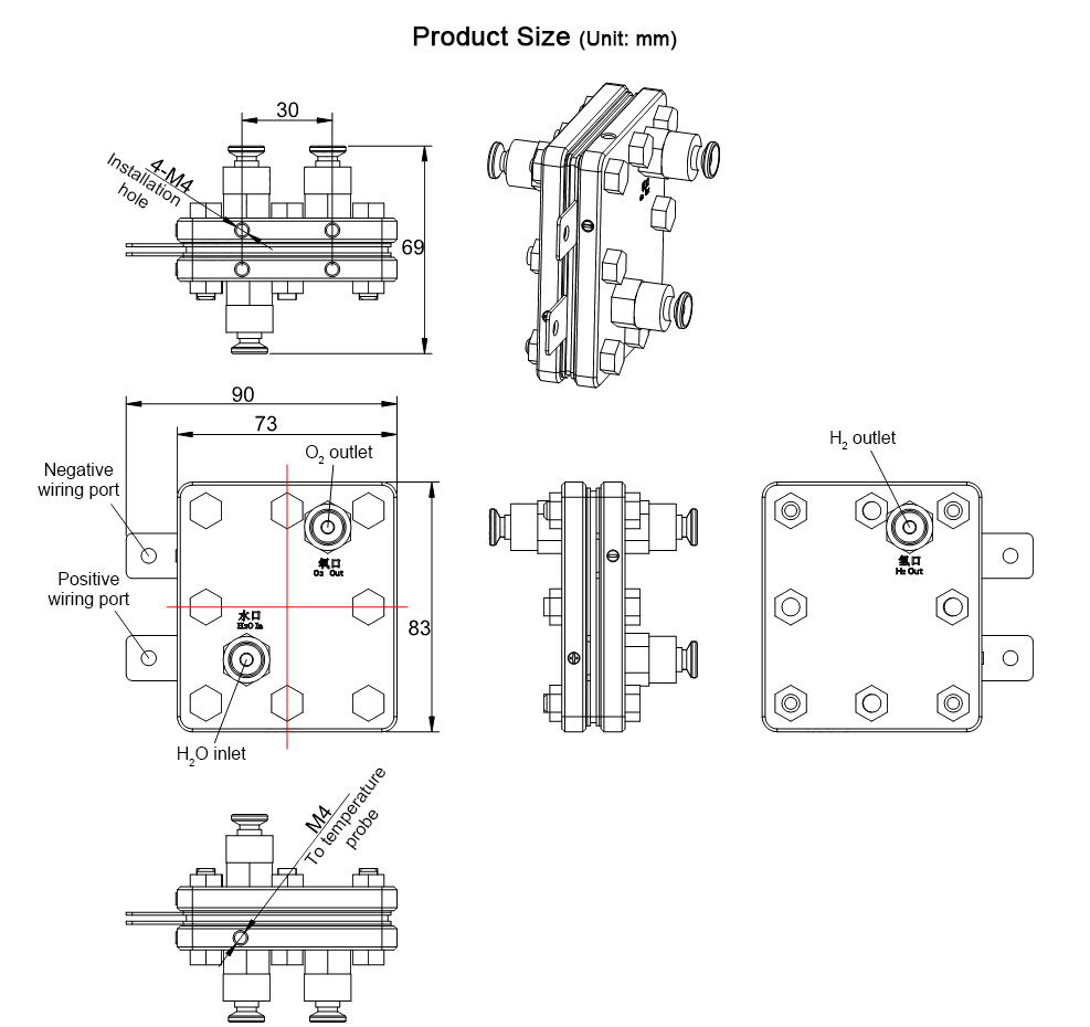 The product adopts aluminum alloy outer end plate, food-grade silicone seal and titanium material accessories. Internally encapsulated proton exchange membrane electrode for Nafion is used.