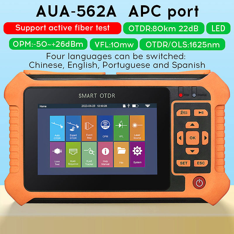 1625nm AUA562A APC Port OTDR Optical Time Domain Reflectometer Support Active Fiber Test 4.3-inch Touch Screen