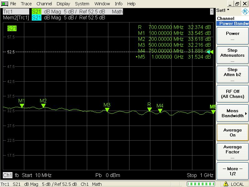 The figure below shows 15V, input 5DBm saturation power output, the output power of all bands is greater than 32dBm. In the frequency band below 700 MHz, the output power is greater than 33dBm (2W).
