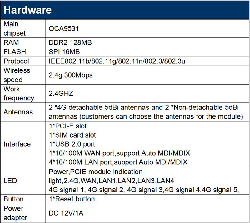 WE2416 uses the latest Qualcomm QCA9531 chipset wireless solution,with stable performance and rich functions.It can bring more user experience.2.4GHz can be up to 300Mbps,provide 1*USB 2.0 port,1*SIM card slot to support 3G/4G function after install 3G/4G PCIE module inside of router.It is provided 3G/4G signal strength LED to display show the signal status.