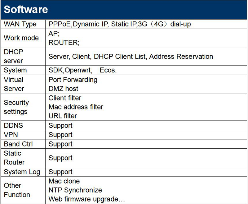 - Supports IEEE802.11b/802.11g/802.11n/802.3/802.3u