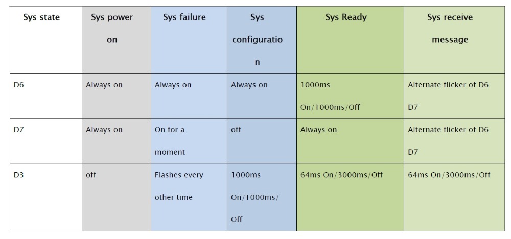 LED interface: There are three LED lights named D3 D6 D7 (D7 is close to the positioning hole, D6 is close to the antenna interface). LED indicator state corresponds to the equipment working conditions are as follows, each column is one state.