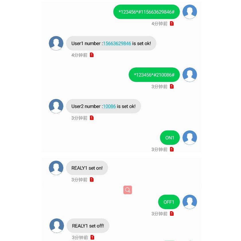 Relay1 On command: ON1, after successful setup, the device will reply SMS is: REALY1 set on! For example, send the SMS: ON1. Relay status will be saved.