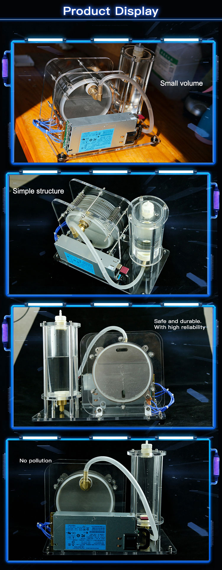 The main structure of the product adopts transparent acrylic, and the reaction process is intuitive and clear, which is convenient to view the remaining solution and convenient for users to explain the principle and process. It can be used in teaching, glass heating processing, jewelry heating processing, hydrogen and oxygen welding, thin metal cutting and all kinds heating.