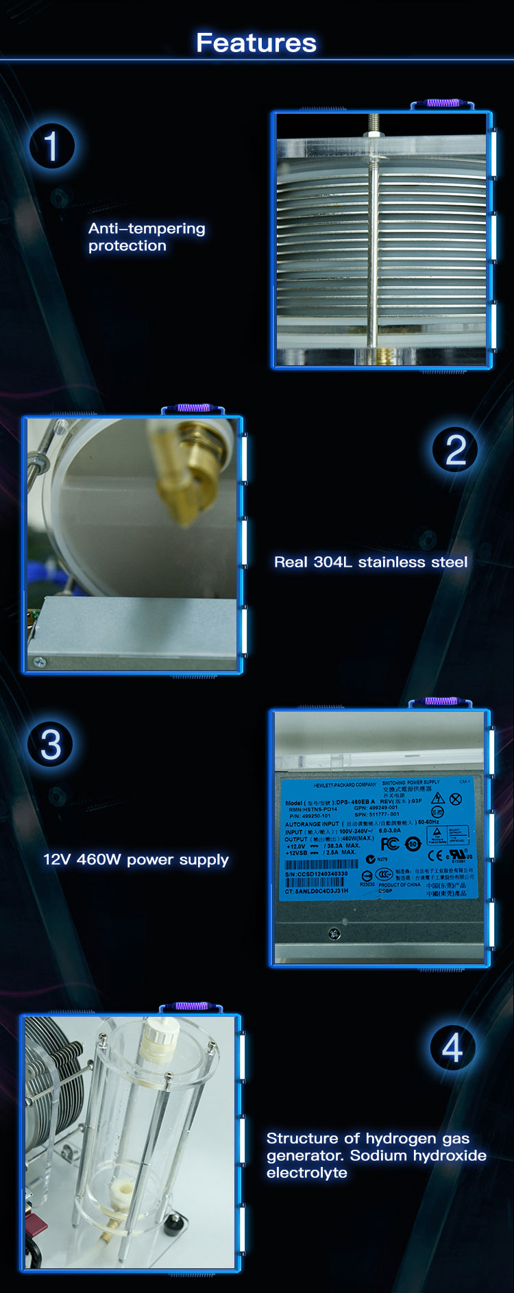 Hydrogen gas generator features high efficiency, easy maintenance and good heat dissipation. Electrolysis of water will generate hydrogen and oxygen. Hydrogen and oxygen will generate water after ignition, and no pollution is generated in this process. After the liquid falls, you can add water, and the only thing that consumes is electricity. Unlike ordinary gas, solid and liquid fuels, there is no carbon dioxide produced in the heating process, nor is there insufficient combustion, nor will there be by-products such as burned black and carbon ash.